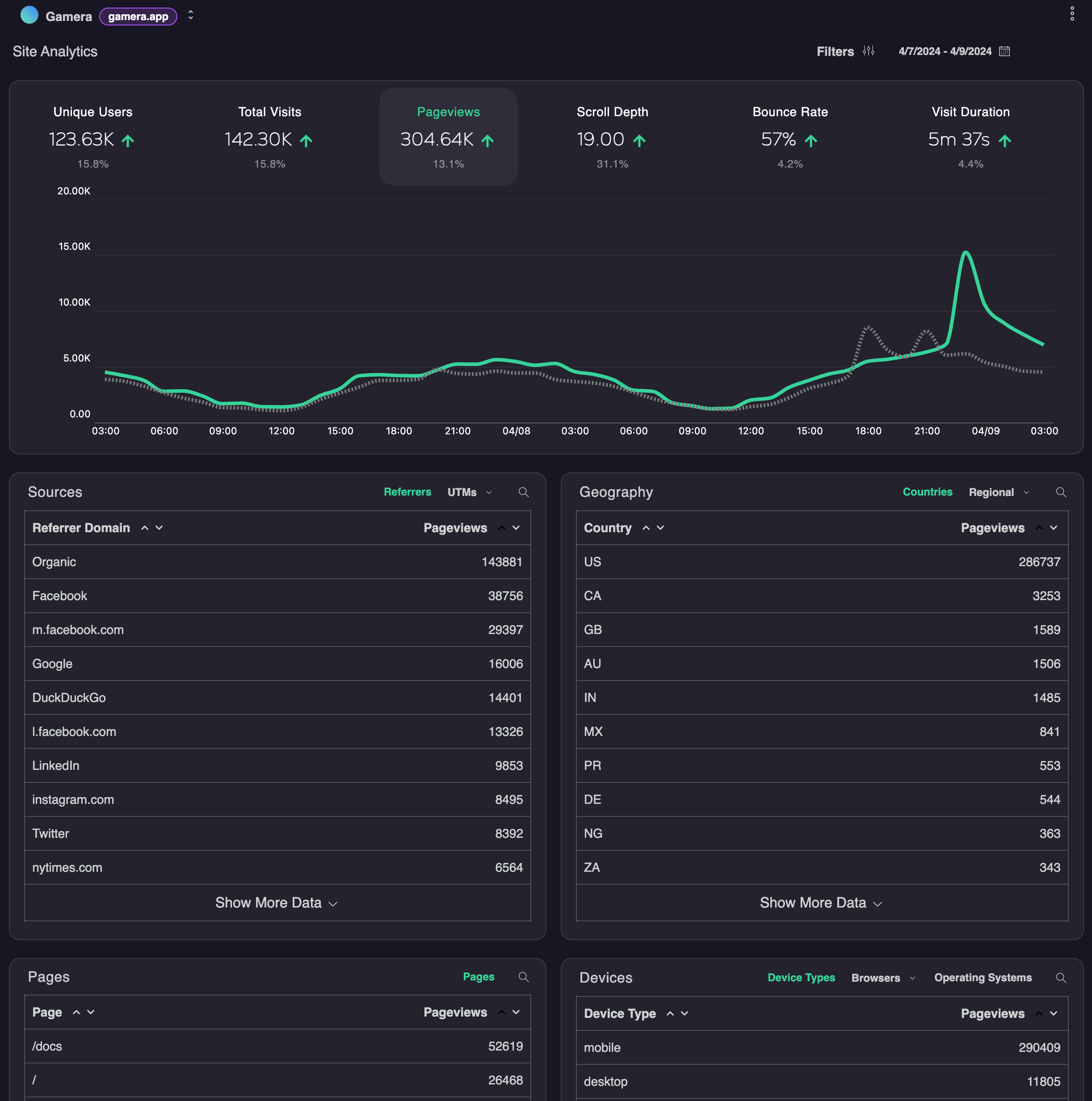 Google Analytics is slow, confusing, and worst of all tracks users from site to site. Gamera is fast, simple, and respects user privacy.