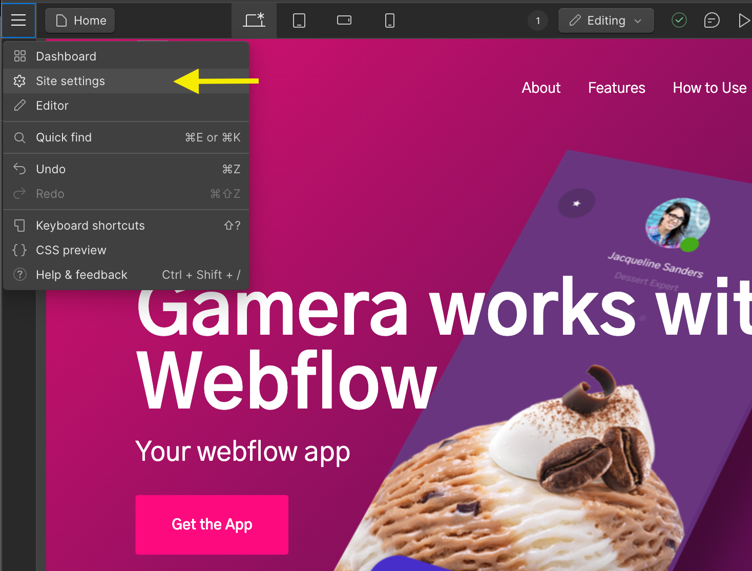 Adding Gamera to your Webflow site is extremely simple and can be done directly from within the logged-in Webflow site designer. Simply follow the instructions below: