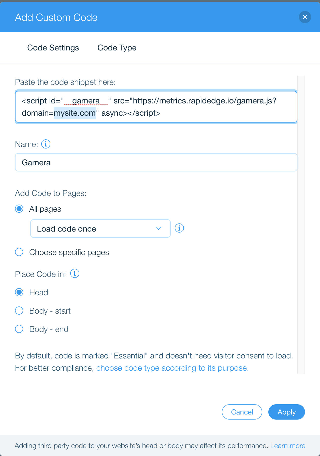 <script id="__gamera__" src="https://metrics.rapidedge.io/gamera.js?domain=mysite.com" async></script>IMPORTANT